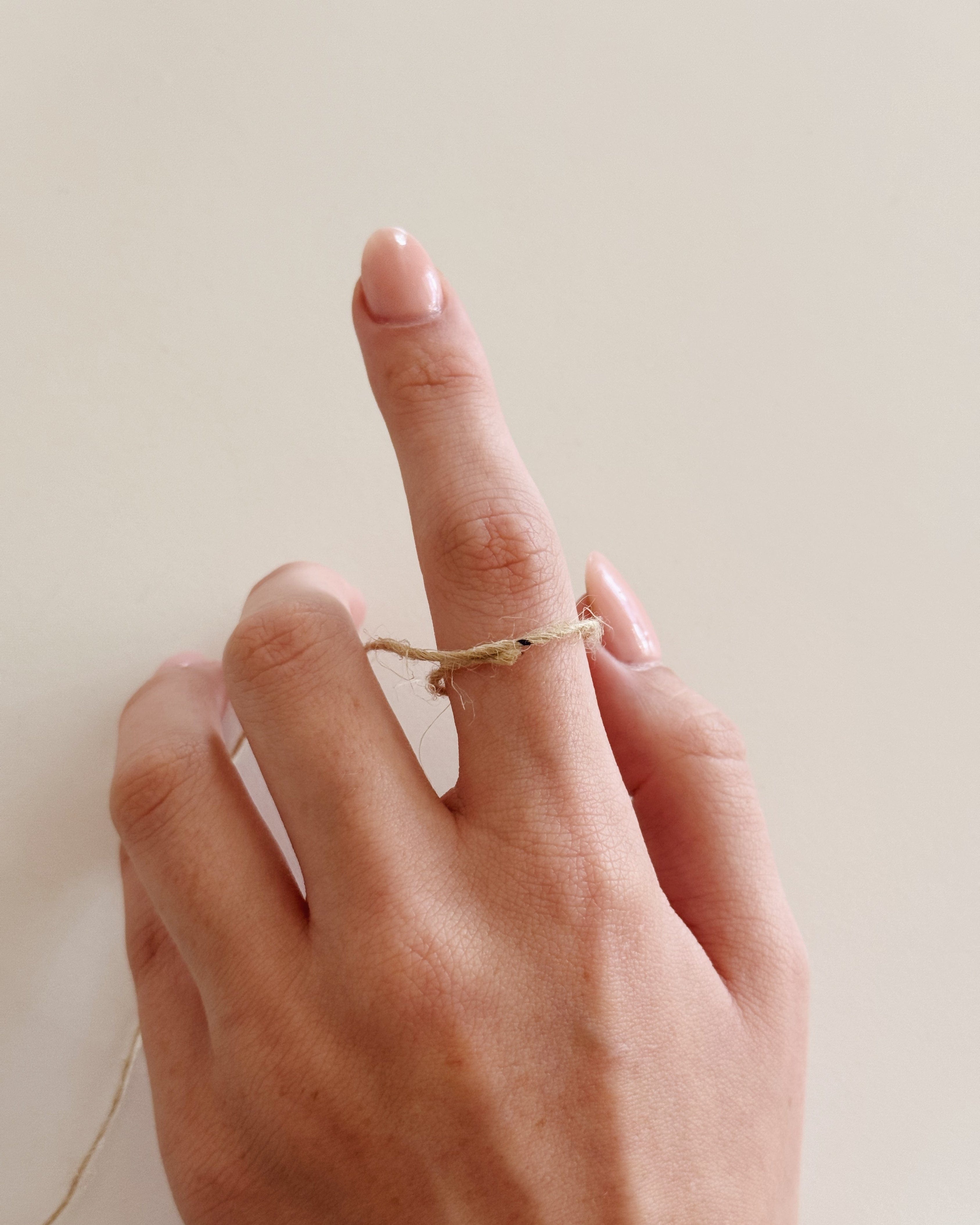 1. Coge una tira de papel fino o un hilo y ajústalo alrededor del dedo que quieras medir.
